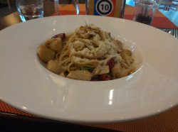 吃的是香蒜辣椒鸡肉起司意面,不同于一般的意大利面,这个是干拌的,不是酱浇式的,味道不错;这是家新开的店,环境很好,我一直比较喜欢玻璃房的风格,下次有机会去露天花园吃个下午茶