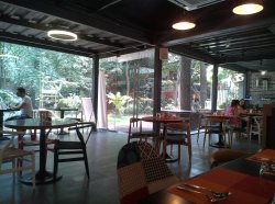 陕西路上不起眼的意式餐厅,就花园楼房门口挂了个大招牌,穿过郁郁葱葱的露天花园进去,能感受到习习清凉空气,心情大好,周末,就该这么过。餐厅就在花园左边的一间平房里,落地玻璃大窗,里面的布置比较简洁休闲,小方桌摆放的蛮随意的。优格水果色拉 带点甜甜酸酸的优格乳拌的色拉,里面有蔬菜和水果,喜欢里面的水果。酸辣海鲜色拉 有点泰式的风味,酸酸辣辣的味道蛮好吃的,里面还有不少海鲜哦。白酒奶油海鲜意大利面 哇,好多的芝士奶油好多的海鲜噢,放了白酒一点也不腥的,鲜,好吃。香蒜辣椒鸡肉芝士面 有点辣辣的很爽口开胃,味道不错。欧姆蛋 很嫩的蛮好吃的,还配了那么多花式的水果,不错。早午餐(美式) 里面有香肠、面包、蔬菜、水果、鸡肉等,品种好多营养好丰富的,喜欢。芒果奶酪 原味的奶酪配上新鲜的芒果,不错噢,上面的芒果粒不少呢,甜。
