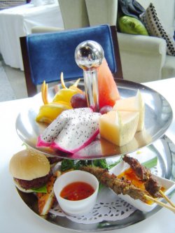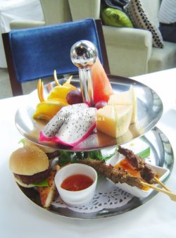 早就想来这里了,今天终于成行。就在“襄阳公园”内,户外很适宜,有柔软的沙发大靠垫,但热门的地方总是抢手,这里的下午茶供应时间是2:30-5点,客满,稍等一会才挨到一个室内的位置。靠窗很近,真有微风拂面的感觉,相当舒服。自然采光也很舒服,所以我就不带单反了,小卡也不错啦。下午茶有2人享用的套餐,98元的价格也可以接受,最好的是上网的速度超快,赞,难得一次信号超好的。有英式、亚洲、法式三种,挑选了一亚洲的先尝下味道。套餐中包括泰式甜点,椰汁马蹄还有西米,口感也挺醇正,甜的时候,椰香味浓,有细小的马蹄颗粒,很清口;马来沙爹就是malay satay,2个肉串,很香,特别是沾一下配好的酱汁;泰式炸鱼迷你汉堡,个头确实不大,2-3口解决,有香料的味道,还可以;金枪鱼多士,也是迷你的,上面铺垫了金枪鱼不算多,但多士的皮有点脆;好几种鲜水果,有火龙果,我的最爱,蜜瓜,够甜;其他还有葡萄2颗,橙子2片,西瓜2片。总体还是蛮好的,晒晒阳光,喝喝下午茶,让阴霾远离查看更多
