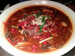 椒麻鸡推荐,真好吃,肉切的偏大块,很嫩滑,同时花椒的麻味都出来了,但是不过分。这个真心推荐臭豆腐汉堡,也是特色,里面的炸臭豆腐干虽然薄薄一片,却很好吃,香酥,而且该有的臭豆腐香味都出来了。作为嗜好臭豆腐的一员表示很满意。外面就是炸馒头,配炼乳吃,蛮好的上酱肥牛土豆泥,分量蛮大的,土豆泥很多,肥牛都很大片。味道有点像千岛酱,带点酸味面包诱惑 也是做得不错的,几个人一会儿功夫一抢而空。朋友坚持要点的蛋黄南瓜,好像就16块,分量不错,本来不报希望,蛋黄南瓜吃过好几家都做的蛮难吃的。没想到捡到宝了。非常好吃!蛋黄味道不是很浓,炸的外酥内嫩的,香甜味都出来了。推荐海鲜毛血旺一般,有点偏油查看更多