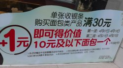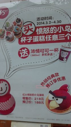 今天出门逛街,路过好些家85度C,看到玻璃橱窗上都张贴者单张收银条购买面包类产品满30元,既可以+1元得到10元及以下面包一个(不含土司),第一波截止到今天。错过的朋友不要不开心,因为85度C同样的活动(即第二波)在4月21日~4月27日又要展开。虽然这个活动还有些限制条件(比如乐活早餐及午后甜蜜餐不参加活动,交通银行积分兑换不参加这个活动等等4条),但是喜欢85度C面包的人们是一定不会错过这次活动的。 说动交通银行积分兑换,在14年8月31日前,平日每400积分=1元,仅周五200积分=1元。这个活动具体细节我也拍了照片,大家看图片,有图有真相。 85度C现在有推出愤怒的小鸟系列蛋糕,做的好可爱。愤怒的小鸟杯子蛋糕每个12元。现在买3个还送浓情可可一杯(360ml)。那个红火愤怒的小鸟大蛋糕要218元,现在预订价是188元,还挺可爱的,送给小朋友,肯定大受欢迎。…查看更多