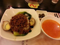 卤肉饭话说味道不错,主要是大米很香,辣肉拌面的面条很筋斗,辣肉的辣也能接受,但肉少的可怜,素鸡色泽白白的但入味,不过他家送咸菜甜甜的,我很喜欢吃哦,香酥猪排点了本以为可以解解馋,但速度很慢,没炸透,吃起来口感不是很好,总体没特色,价格小贵。