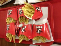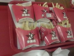 对多食达觊觎许久,终于有机会和朋友们一起来吃一次了。 我们大家在点评网上面一共团购了几份套餐,双人餐是37吧好像,单人餐20块大洋。 我吃了单人餐,里面包括一个叫做“猪霸芥”的热狗&一份薯条&一杯可乐。因为天气比较冷,想喝热的,就加了2块钱,把凉的饮料换成了热饮——奶茶(味道还行,奶茶的味道不是很浓郁,幸好不是很甜,不齁嗓子),热饮的其他选择有:柚子茶、牛奶、咖啡、巧克力奶、青芥吧,是不是这个名字我忘了。。。 热狗的味道没给我留下太深的印象,跟平时吃的热狗没什么区别,里面夹了一根长长细细的香肠,有一点点小配菜,面包较软。个人还是更喜欢吃宜家的超级热狗的,性价比比这个热狗高多了!好吃又实惠! 让我欢喜的是,他家的薯条。从外形来看,就博得了我的喜爱。短短的、粗粗的、胖胖的,上面还洒了葱末之类的调味料,咬一口,外焦里嫩,咸淡适中,一口下去,很有满足感。炸的火候刚刚好,不会太硬,也不会偏软,是我喜欢的口感。因为有薯条,才让我觉得这家店没白来!给薯条赞一个吧! 从份量上来说,一个人吃一个单人套餐的话,可能吃不太饱,只能说是垫肚子了。 从环境和服务来说,因为是开放式的就餐形式,路过的人多的时候会比较吵,服务一般。 对了,忘记说了Ps:这家店的牌子上面画的是狗星星/星星狗呢,而且热狗的名字取得都很有意思,比如:猪霸芥、牛魔王。查看更多