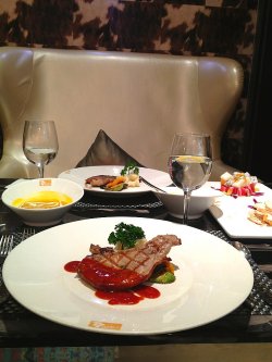 本人是团购爱好者,一般价钱稍微贵点的,都会选择团购去。这间店每次去万达经过就被装修吸引了,于是就约上朋友一起去。团购了双人餐,然后还约上了两个朋友。5点半去就算预定了还要排队,于是等了10分钟。等位区还有很多红酒,环境真心不错。团购的菜主菜牛排,基本上没怎么吃,7分熟有点老,切不断。虽说团购前菜,汤,主菜和甜品都有,但是分量太少了。甜品三颗哈根达斯冰激凌,完全不像。芝士蛋糕也很一般。奶油南瓜汤太难喝了。焗蜗牛还不错哦。朋友他们不是团购所以沙拉和汤还有甜品都可以免费续挺划算的。所以吃完了之后感觉没吃饱,看朋友点的管子面不错,又点了一份。这样算起来团购也差不多200,朋友他们不是团购才150,太不划算了。这次就当尝鲜,下次也不去了。…查看更多