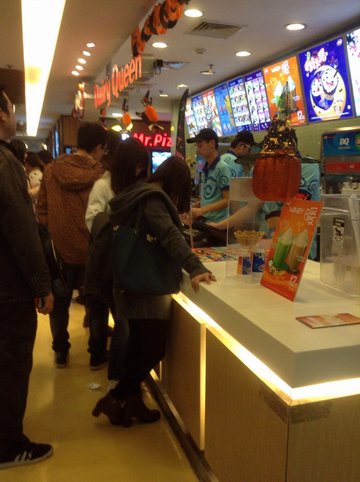这家店位于大悦城的六楼,人很多,要排队,服务员态度一般,可能比较累,自己看单子,自己点,要了两个奥利奥暴风雪中杯,服务员把杯子倒过来,真的不撒,很惊讶,很大一杯,奶味很浓,比麦当劳的浓很多,质地也很实在,奥利奥是大块的,很多,吃了半杯吧就吃不了了,开始腻了,因为太甜,不知道有没有小杯的,其他的口味没试过,应该也不错。价格小贵,不知道有没有优惠券。…查看更多