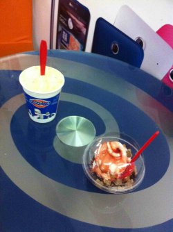 这家DQ冰雪皇后位于海淀区科学院南路44号UME华星国际影城的侧面,哈根达斯的隔壁。这家店整体来说因为靠着电影院所以生意非常好,再加上店面本来就不大所以显得很局促。某天等着看电影的时候和朋友一起吃了吃玩,一杯芒果口味的暴风雪,一杯樱桃口味的冰激淋球,暴风雪的味道就中规中矩拉,那个樱桃的冰激淋口味还满奇怪的呢,樱桃酱一点都不酸,而是在甜里面略带点酒味,搭配得核桃脆也很特别,是类似脆香米的咚咚包裹了小颗的核桃仁,所以吃起来核桃味道不是很足,而是有点香脆的感觉。查看更多