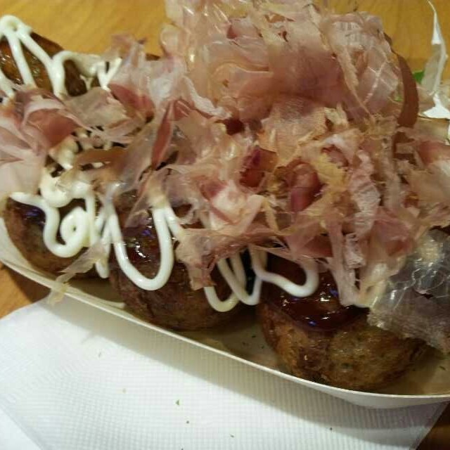 去芮欧百货楼下买了Gindaco章鱼烧里面的原味章鱼烧作为饭后小食,他家的章鱼丸子个头好大噢,有点和平常吃的小型狮子头差不多大小了,好给力的,刚出炉的章鱼丸子外面还是脆的,搭配木鱼花和色拉酱以及酱汁整个味道别提多香了,每个章鱼丸子里面都有算是比较大块的章鱼须,口感赞赞哒。…查看更多