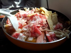 锅底比较稠厚芝士年糕很少,但是非常好吃,里面有拉丝.口味偏甜五花肉,芝士年糕,面都可以另外添加.锅子火力很足,一下子就烧开了.吃到一半的时候加了面,但是东西太多了,差点扑出来。服务还不错,挺热情的。虽然很忙,但也算是随叫随到。饮料比较贵火锅整体价格还还可以,东西也很好吃