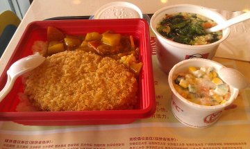 以前的公司在这附近,所以工作餐偶尔也会来这里将就一下。终于有一天吃腻了汉堡这一类的洋快餐,但是附近也没什么别的选择,于是来吃个肯德基家的米饭。猪排饭套餐,配餐是芙蓉鲜蔬汤和玉米沙拉。玉米沙拉的味道不错,清爽不腻,甜玉米和黄瓜咬在嘴里脆生生的很爽口,芙蓉鲜蔬汤的感觉一般,味精味道有点重,虽说热乎乎的但是还是不够喜欢,虽然比较重口味,但是并不偏爱味精很多的汤。重头戏在猪排饭,猪排炸的金黄,但是估计是为了午餐时段能快速出品,所以并不是现做而是保温产品,卖相不赖但是入口不觉得很香脆,看起来一整块的猪排,其实肉质不是很丰满,上面的面包糠其实才是主角,并不美味;搭配的汁看起来很像咖喱,但其实不是,味道也很淡,不够美味。随便吃一顿就好,不算挑剔也能填饱肚子的。服务态度不错,环境也尚可。…查看更多