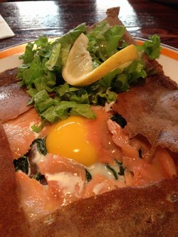 一直想来的店,居然《淘最上海》里也介绍了。索性同事聚会的时候就毫不犹豫地推荐这家店啦,正好大家都感兴趣,所以拔草了。晚上去的较早,所以店里还蛮冷清的。装修简洁风,木质桌椅。我们四个人坐低的桌椅,不习惯靠窗那边的高桌椅。服务员穿的都是条纹衫。看了一轮菜单,还是决定吃咸的可丽饼,四个人点了四种荞麦皮的,我点的是鲑鱼,菠菜,蛋,味道还不错,菠菜超级多。一同事点的是牛肉粒,洋葱粒,西红柿,荷包蛋的,牛肉粒粒小来,卖相不错。一同事点的是芦笋,2根饼的,里面也是肉肉粒。还是一同事有香肠的饼实在呀。苹果酒,点了2种,甜得和干得,甜得酒精含量低,比较好喝,干得不怎么爱。还有罐装澄汁一杯。牛肉菠菜卷,一般般吧,都是饼的外皮呀。最后点了个火腿色拉,火腿肉肉好吃的,还有旁边的橘子酱味道也不错呢,下面也有张饼皮。这顿都是饼,总而言之,还是觉得山东煎饼的饼皮好吃呀。…查看更多