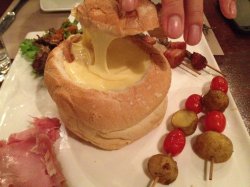 很不错的一家餐厅,环境比较幽暗,很有feel,有点像酒吧的感觉,非常适合朋友来聚会。点了这里的招牌,上来着实吓了一跳,非常大一个面包,外面还留着芝士,极度诱人。把面包翻开,里面满满的是芝士,芝士味道闻起来酸酸的。面包的味道很普通,但是很有嚼劲,里面的芝士很厚,要花很大的劲才能挖起来,可以拉好长的丝。试了一下,直接吃的话,味道有点过于浓郁了,酸酸的,有点苦,所以就配合面包一起吃,面包能吸收芝士的香味,面包中的奶香也增加了芝士的香味。芝士浓郁,但量太大了,吃到后面感觉有点腻,纯的芝士不是特别适合中国人的口味。除了面包,旁边还有配菜,这个都挺好吃的,有炸鸡排,这个好像,鸡肉嫩嫩的,外面一层脆脆的皮。还有蔬菜烤肉串,很好吃,烤肉很香,烟熏的味道。还有色拉,色拉新鲜,用的是色拉汁,味道非常清淡可口。非常不错的一次聚会,性价比不是很高,但比较创意,偶尔吃一下,挺特别的查看更多