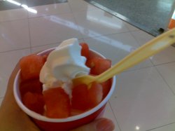 团购买的优惠券,支付了10块钱好像!正好公司楼下就是酸奶坊,也是最后一天了呢!下班的时候去的,去的时候没什么人,只有两个服务员,态度很好,我说实现过酸奶,就帮我做了一杯呢,还加了三小勺的西瓜丁!酸奶冰激凌吃起来酸甜适中,奶香味道十足哦!习惯定很清爽就是小了点哦!不过搭配着很舒服!查看更多