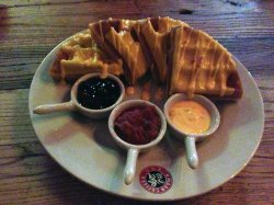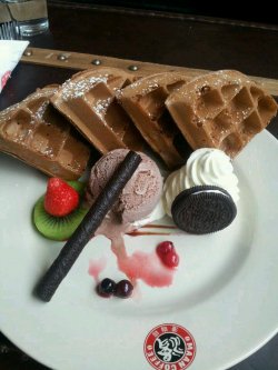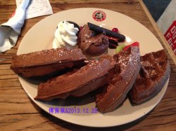 他们家地方很大,一共有二层,一楼地方比较小(无烟区);二楼很大(吸烟区),还有个玻璃包间,不过很难坐到吧。。。进门欢迎光临倒是叫的响,里面没座位,服务员倒是视若无睹,也不帮忙调剂:(没有菜单滴,有实物样品,这样点餐也倒是很方便,一目了然。巧克力松饼,用正大乐成会员卡买可以打折,折后34元,蛮便宜的。松饼现烤的,吃起来外脆里松,沾上巧克力冰激凌和奶油吃,甜蜜无比啊。还有一个做装饰用的蛋卷,也蛮脆的。查看更多