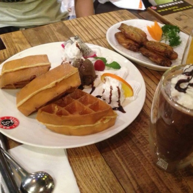 超级喜欢吃漫咖啡的华夫饼很好吃特别是冰激凌华夫饼三个冰激凌球入口即化的 华夫饼热乎乎的时候吃最好了松软可口的很不错 棉花糖热巧克力也不错天冷的时候喝一杯很暖身 环境不错