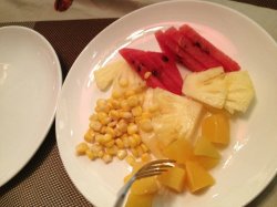 有水果、蔬菜沙拉,还有烟熏鸭胸肉沙拉耶!烟熏鸭胸肉沙拉,味道还不错,最喜欢的是用玻璃杯子装着,还配上菠萝,感觉档次立马上来啦。一不小心消灭了4杯