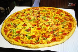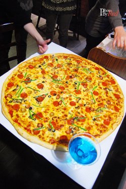 慕名而来,门面好小,容易被忽略唉。进门穿过摆着CD的长廊,进入了酒吧风格的披萨店。吧台很有腔调。装潢很注重细节,摆设与整体环境很搭。厨房门口挂了个写着kitchen的披萨,创意独特。想必大家来这家店的首要目的都是想见识一下那个28寸的披萨吧,看看到底是有多大。真的哦,端上来一个圆台面呀,跟28寸合照那是必须的,感叹自己脑袋好小哦。所以友情提示要尝试28寸的,务必成群结队,呼朋唤友!浪费粮食可耻哦!比较适合聚会派对啥的。实在没那么多人,个人感觉22寸的性价比很高,只要168左右。我觉得价格上是有优势的。芝士还不错,拉丝很长。查看更多