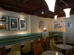 门面都让给了落地窗,门就显得较窄不显眼,门上也无“推/拉”标志。进到店里,顿时给人一种清凉的感觉,虽然空调打得不是很低。店面布置得较为清新淡雅,色调都是浅浅的,浅绿、浅桔、浅黄、浅白。。。地砖和墙砖稍带出一点彩色,黄色的吊灯也有一点暖意。沙发椅坐着很舒适。只是店员看上去面无表情,一点笑容都没有。主打意式咖啡,也有面包和简餐。中午有38元午间套餐,还有下午茶。选了摩卡(30元):咖啡一会就上了。厚厚的奶油加上巧克力棒和巧克力酱。咖啡较为香醇,奶油很纯正,味道不错,也不会甜腻。查看更多