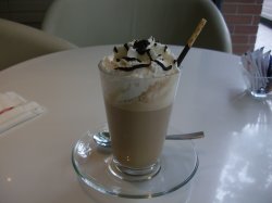 要了杯摩卡,透明的杯子里,2/3是装着咖啡,上面1/3堆着厚厚的奶油。白色的奶油里,夹着巧克力酱,旋起一大多奶油花,巧克力酱仿佛是勾勒出花瓣的轮廓。一角,还斜插着巧克力棒。咖啡不是太甜的那种口感,也不是很苦,恰到好处的淡雅,又不失咖啡香。查看更多