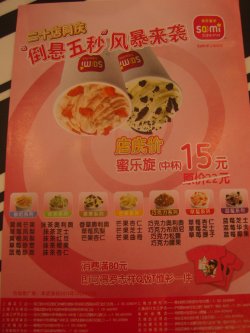 最近它家正在搞二十店同庆:倒悬五秒风暴来袭的活动,虽然不清楚这活动的意义何在,但店家打折了倒是实在的,像它家经典的蜜乐旋冰激淋的中杯,就从原价的22元,降到了15元。它家在南京西路上的分店,位于五江路上的湟普汇大楼里的一楼,一进去大楼就能够很快的看到它家明亮的店门,店里也宽敞明亮,再加上用的是糖果色调的装修,一看起来就给人一种心情大好的感觉,而索非蜜斯的带言人小猪罗志祥的招帖像,在店内店外到处可见。处于对酸奶的热爱,索非蜜斯的招牌的蜜乐旋中,我不由自主的还是首选了酸奶系列的口味,在五种配料中,选择的是黄桃凤梨。工作人员的操作很迅速,不用30秒,就将一杯酸奶蜜乐旋递给了我,不过在给我之前,还真的先倒旋了几秒,冰激淋也果真没留出来。我把冰激淋端到它家二楼的就餐区品尝。酸奶的味道在前期还是能吃出来,可是吃到后面,因为冰激淋太冰了,让舌头有些麻掉了,就不太能吃出酸奶的味道了。而冰激淋的口味的确很浓郁,却不腻味,略觉得欠缺的却是,酸奶蜜乐旋融化的速度却有些快,我想满满品尝的,可是只吃到半杯的位置,酸奶蜜乐旋已经快化成酸奶了,于是后半程我是马不停蹄的饶动我的勺子,尽量在冰激淋还有形状的时候吃掉它,所以才会觉得很凉。作为配料的黄桃和凤梨都很新鲜。查看更多