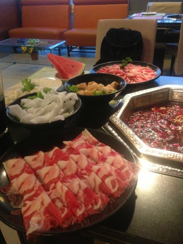 T6香辣火锅建国路88号SOHO现代城B座底商(大望桥西南角), 国贸。地方非常大的一家涮肉馆子,周末风大天气也很冷,所以感觉屋子里面特别的暖和呢,而且客人也很多,要了那个传统的鸳鸯锅底,不能吃辣的人,可以咬哪个清汤的味道,非常的方便,他们家的肥牛很不错的呢,种类很多,那个雪花肥牛很不错,看起来有很多白白的肥肉,下锅后,肉片完整,捞出来觉得肥肉不怎么多,入口感觉肉质很鲜嫩,挺好吃的呢。