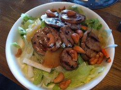 Va Va Voom越时代在蓝色港湾里面的人气一般,可能是因为价格不算便宜吧,味道尚可的。春卷是牛肉馅的,牛肉都是烤过的牛柳肉,肉质特别的松脆的,表层还粘了一些芝麻,味道蛮香的,搭配了一点洋葱和胡萝卜,都是重口味的东西。泰汁烤鱿鱼,鱿鱼是很大,烤了以后厚度还是挺厚的,而且口感很爽脆,泰汁的味道有些甜,感觉有些番茄的成分。…查看更多