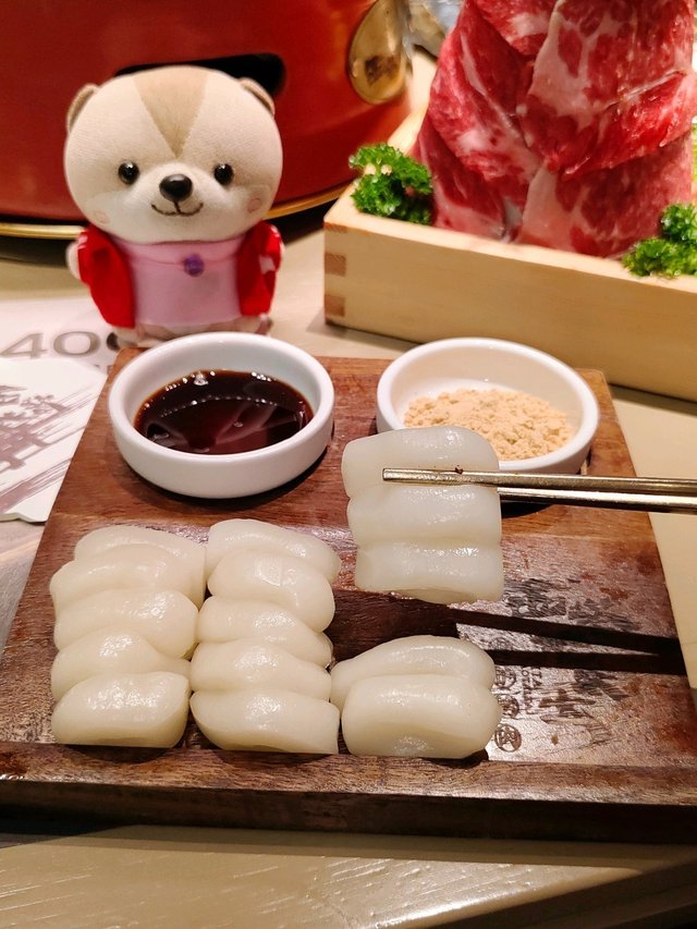 等待吃肉肉的時候,吃個軟糯年糕唄。用了小木盤裝著,放著雪白的年糕。