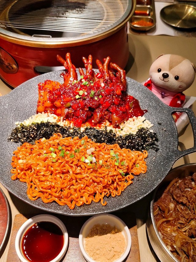 席前加熱味道真香,配著火雞麵充滿韓風,趁熱吃的質感較好。雞爪肉質軟滑,做得挺入味的。年糕質感軟糯,火雞麵辣得過癮。這個會有愈吃愈辣的感覺。