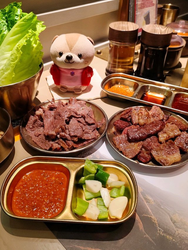 在領展中心城!有家烤肉店工作日也滿座,看來挺受歡迎欵。曾吃這家也覺得出品可以的,這次再來吃一波😎。從福田口岸過來2個地鐵站就到,地理位置方便。旁邊商場還有港人喜歡的超市。店舖在M層食肆區位置,簡約裝修環境舒適,桌子不會太細可以放到多個食物。入座時附送韓式小吃和特色麻醬,配肉肉一起吃別有一番風味🙈。