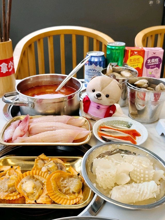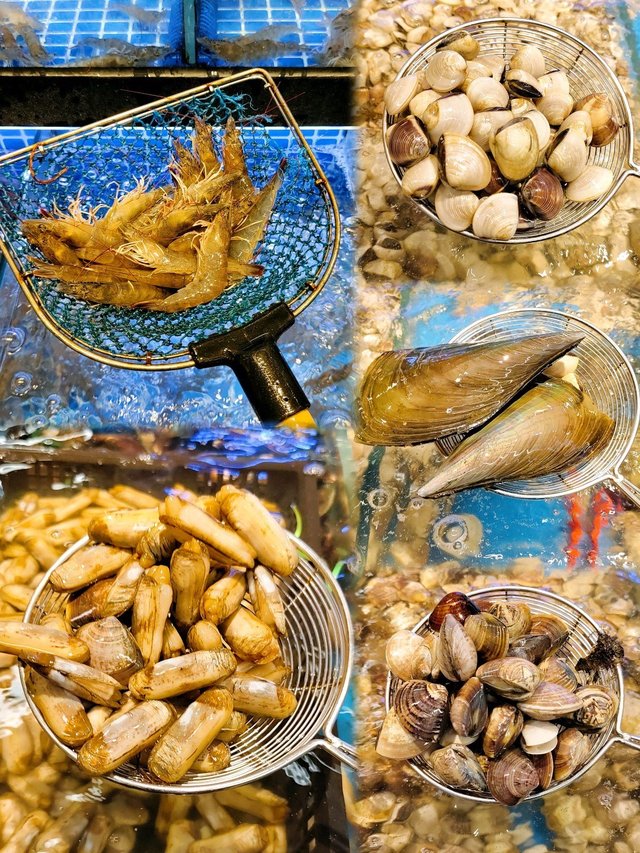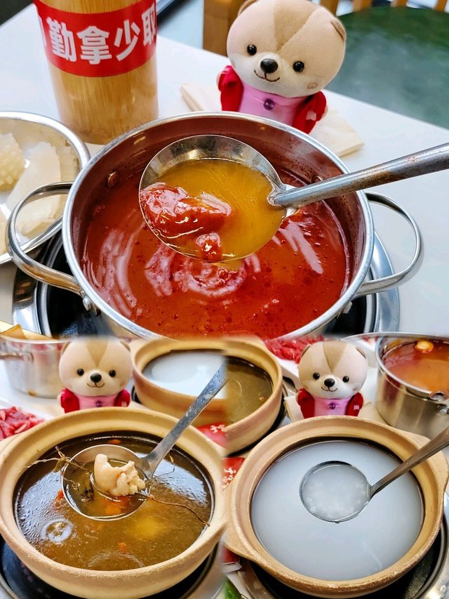 當天的湯底有4款選擇,有辣有不辣口味任你選。我們點了蕃茄湯、石橄欖雞和白粥鍋底,湯底用料豐富味道挺香的。蕃茄湯酸中帶甜挺開胃,石橄欖雞健康又養生,是個有營養又健康de湯底。白粥鍋底吸收海鮮和食物鮮味,再吃粥底味道真香。