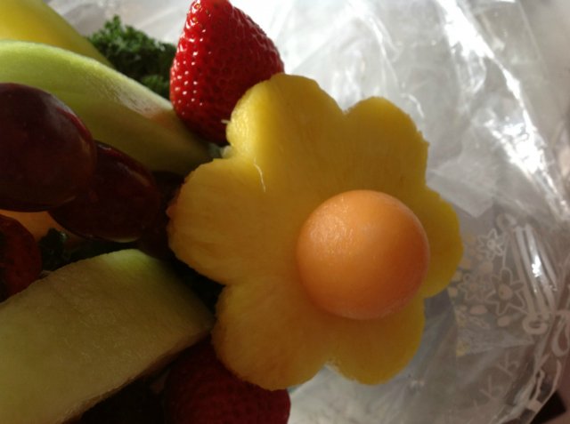 店员态度很好,没有因为是兑换的而区别对待,给配了两个冰袋用于保鲜,还有个大大的手提袋。来看看我的水果鲜花。虽然看起来不大,但是分量还可以。比较喜欢吃菠萝,现在的菠萝是酸酸甜甜好味道,哈密瓜也就普通了。还有草莓跟葡萄。涂着巧克力的那种草莓不是很好吃,太甜了。总的来说199的价格不算便宜,不过偶尔也可以买个试试,感觉比吃蛋糕健康很多。