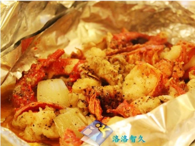 龙虾,被包裹在金箔内,被分解成一块一块的,餐厅特制的酱汁溶合此龙虾,口味的确十分的鲜美~