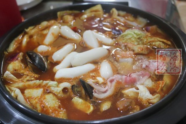 海鲜年糕锅与烤肉年糕锅混在一个锅内煮,配菜是芝士年糕也放入了~