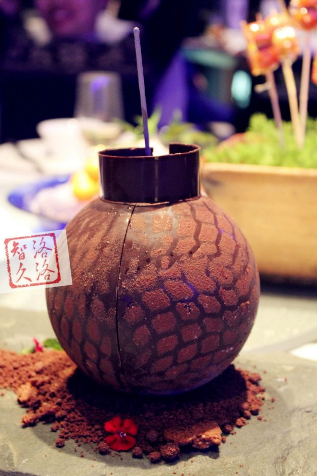 巧克力地雷,188元/例,純粹噱頭的甜品,外型就是地雷,點上火,隨即炸開,裏面6顆巧克力夾雜跳跳糖,全部材料就是巧克力而已~
