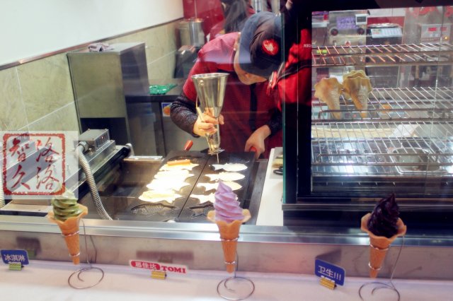 店面只有2個店員,一個年輕的MM是收錢的,另一個應該是上海阿姨,由她來製作鲷鱼烧,透過透明的玻璃窗戶可以現場觀摩製作鲷鱼烧的過程,看著一個一個可愛的鲷鱼烧成型,雖然等待的時間比較長,但還是值得的,畢竟剛剛製作出來的鲷鱼烧燙燙的拿在手上很溫暖!
