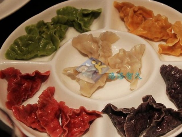 五色水饺,共有5款顏色,每個顏色有3只水餃,洛嘗了一個紫色的~豬肉白菜餡的,其實每款餃子的星子是相同的~不用糾結嘗到不同的口感~只不過每天的餡都是不同的,按時令更改,廚師隨機安排~