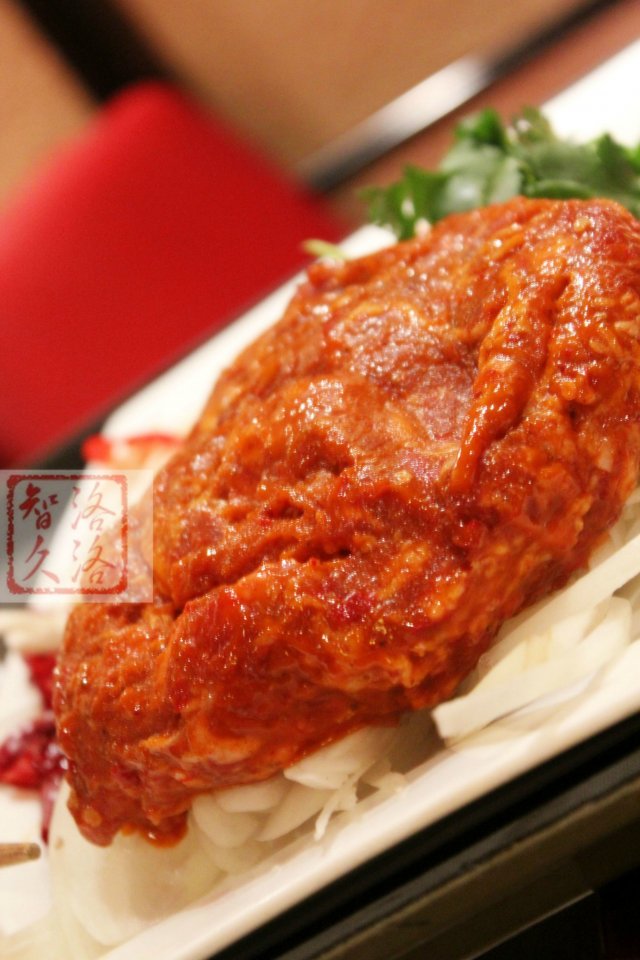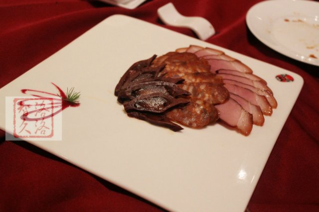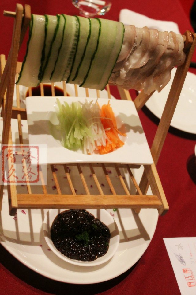 晾衣白肉更需要點一下,很吸引眼球喲!依次晾著黃瓜片與肉片,再夾雜些配菜,不得不說廚師的刀工真心贊!絲絲入扣!再配上sauce~包裹起來品嘗,很是美味!