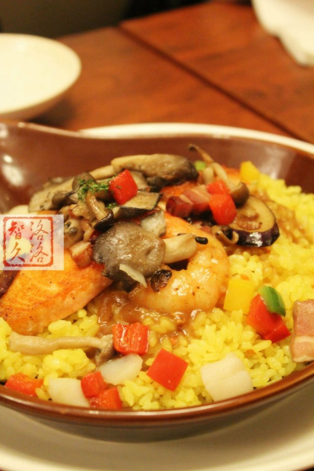 西班牙三鮮炒飯,其實類似於西班牙的燉飯,食材高端,蝦仁,幹貝,三文魚映入眼簾!滿滿的幸福感!海鮮滿溢!色面十分之誘人!