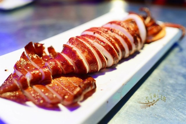 整条硕大的鱿鱼,翘起弹实的鱿须,吐露着明媚的酱色,安卧于盆中,如睡着了一般沉静。连平时不哈鱿鱼的我,也忍不住动筷细细咀嚼一翻,肥厚弹牙,鲜嫩飘香,越嚼越感入味鲜香,与印象中的考验牙口的韧同皮筋,大相径庭。