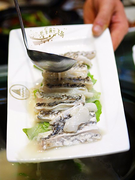 如元宝般精贵的鱼脸肉,整一条鱼才那么两块活肉,足以显现它的珍贵。且看服务生舀起鱼汤淋入鱼肉,顺势推下,待鱼肉泛起如玉般的洁白,便可蘸上特制的海鲜酱料入口,少见的肥厚细腻,少见的鲜活顺滑,便在口中绽放。