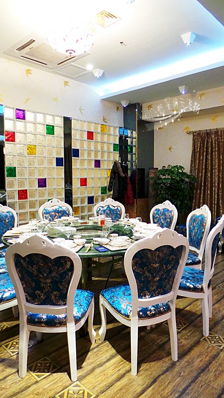沿着定西路无需关注门牌,大橱窗里硕大的“石斑鱼标本”,便可锁定方位。沿着色彩斑斓的楼梯拾级而上,便仿佛在海底漫游一般。随着引领穿越宽敞大厅直奔包间,蔚蓝色的软包隔断,与明灿灿的金砖壁纸,交相辉映,将上海的优雅与青岛的大气合而为一,融汇出强大的气场令人感叹。