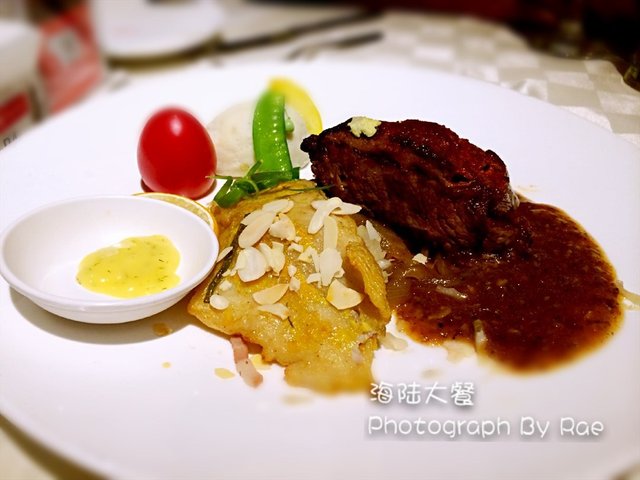 半块厚牛排加上三文鱼,三文鱼烤得很嫩