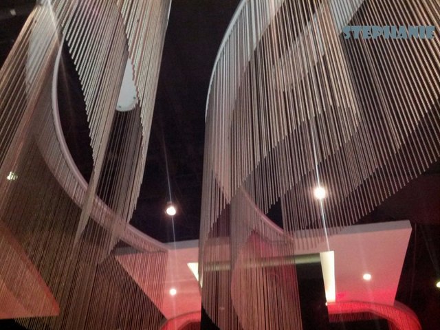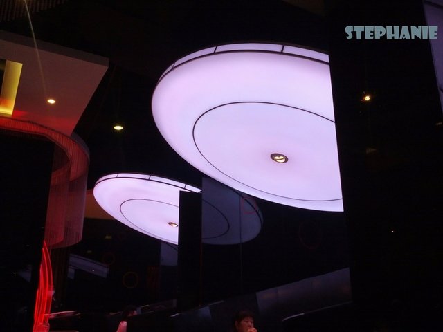 每个圆桌上都有一个这样的大灯,成一定角度,和下面的大沙发,好像打开的珍珠蚌。