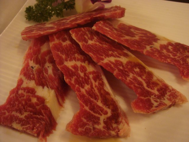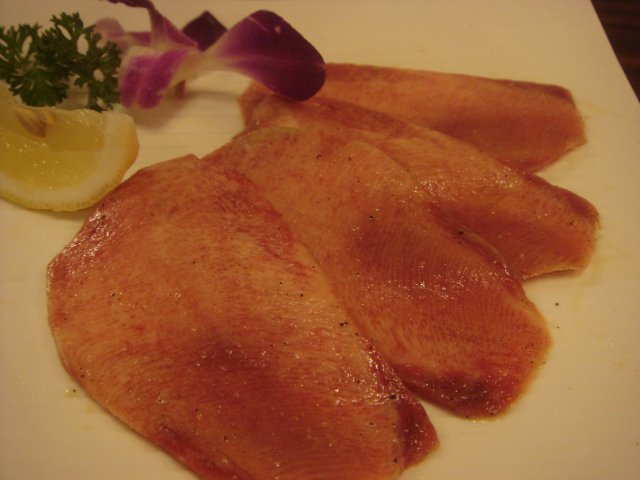 牛舌,一份是4片,当然是可以无限量的点的,上来之后,服务员再给拿过去现场烤,牛舌是日式、韩式烤肉中经常吃的。