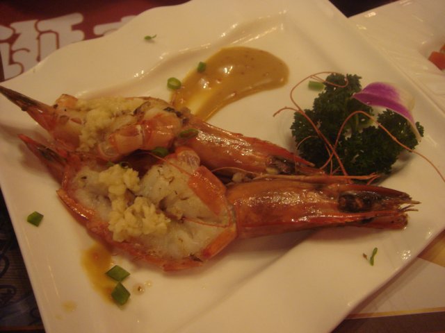 蒜茸开背虾,大虾从背部切开,加入蒜茸,相当赞。