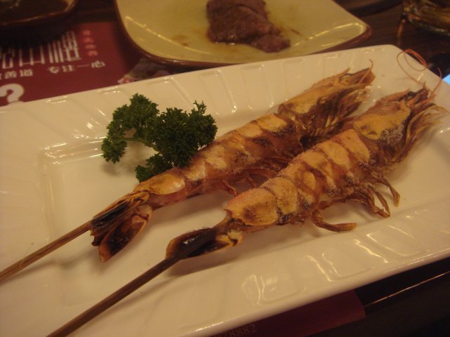 盐烤虾,串在签子上的,外面沾了盐,很喜欢这样的吃虾方法,虾肉很入味。