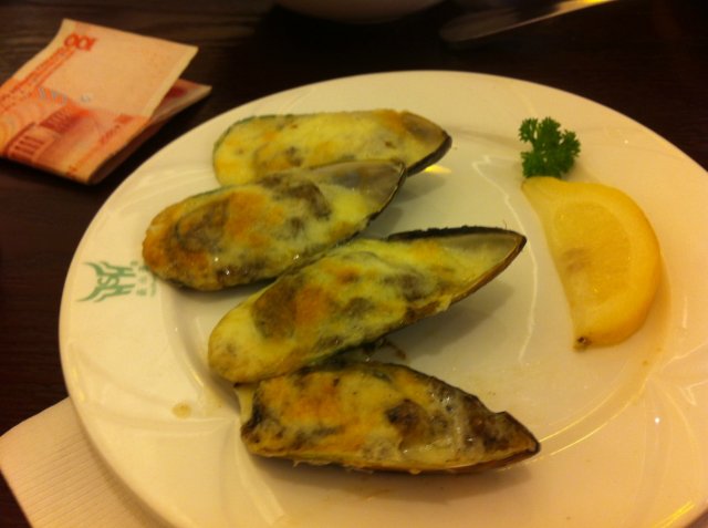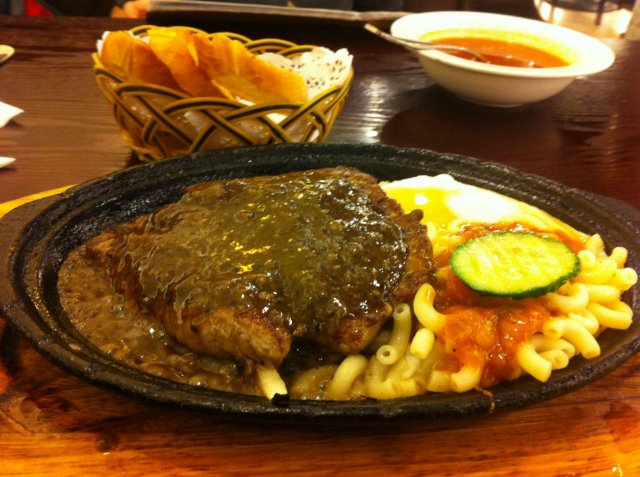 奔着这个理由,我勾搭我好友一块去抢先尝试了一回,刚进去,发现里面环境清幽,不张扬,有种低调的奢华,并且了,服务员的态度是超级好哦~~每个人都给你甜甜的微笑~~我们仔细看了下菜单,发现比豪客来的要便宜些,并且有多种商务套餐供你选择,比较人性化。我们点了一份火焰牛排套餐(五分熟),一份黑胡椒牛排套餐(七分熟),要了一份蒜香面包,一份牛肉烧多士,和一份芝士焗海蛏。我特别喜欢他们家的火焰牛排,外焦内嫩,特别有嚼劲!其次是芝士焗海蛏,芝士浓而不腻,滑嫩的蛏肉被芝士的香味紧紧包围,让嘴巴回味无穷哦~~~~