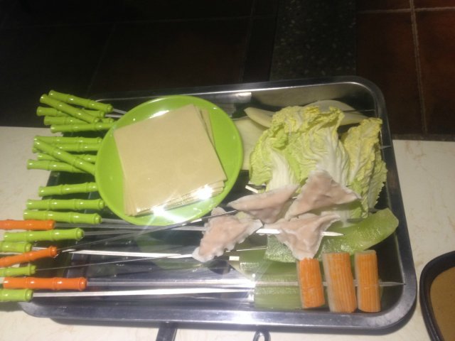 点了番茄岳阳锅底,出了牛肉粒每位限量点外,其余都是自助取,按串收费。