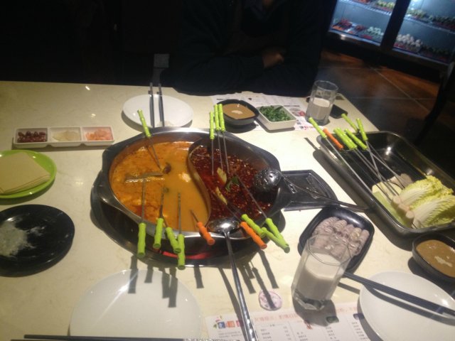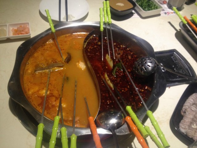 番茄锅底我比较喜欢。酸酸甜甜的。尤其配上娃娃菜和油条,简直美极了。