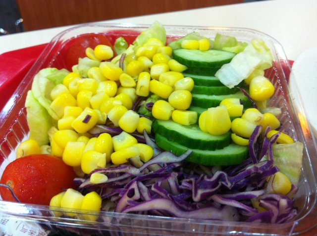 沙拉不外乎和一般快餐店一样,黄瓜片,紫甘蓝丝,生菜丝,玉米粒,千岛沙拉酱^_^