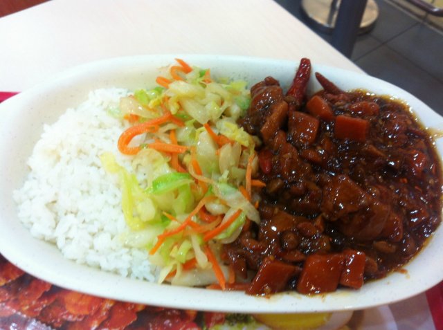 选择了劲辣鸡肉饭,22元:米饭硬是我喜欢的,拌饭好吃!鸡肉真的是劲辣,胡罗卜也很入味的,其中有切成小段的干红辣椒,偶没在意,和鸡肉一并下肚,辣的眼泪快出来了!不过,个人还是很喜欢的,不吃辣的人绕过,可以选卤肉饭的!
